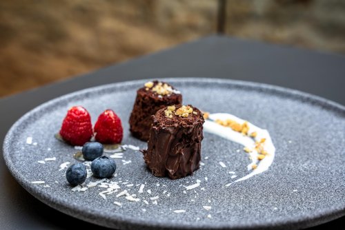 • Pomalu pečený jelení hřbet na celerovém pyré s restovanými liškami, fava fazole, omáčka z portského vína