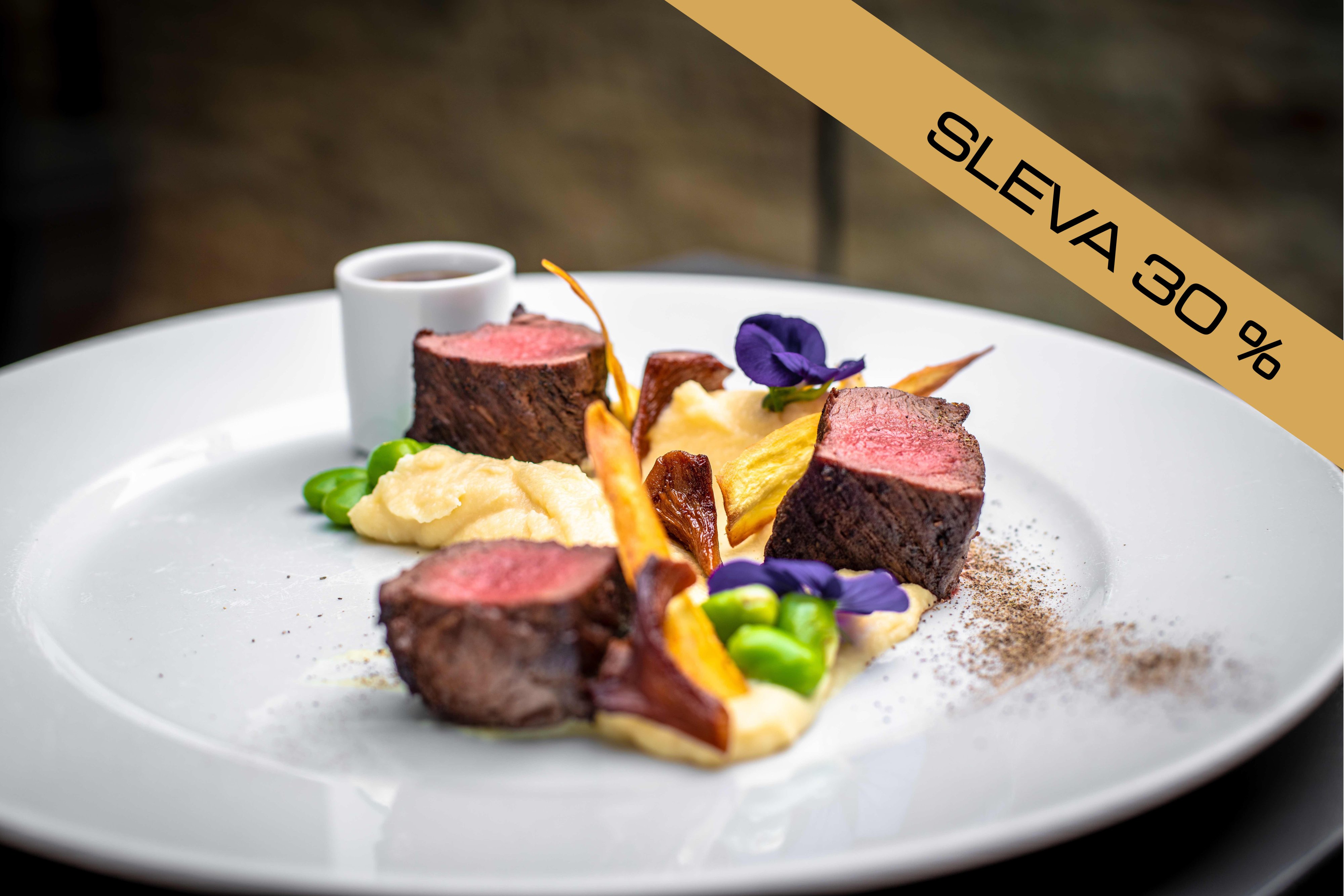- pomalu pečený jelení hřbet na celerovém pyré s restovanými liškami, fava fazole, omáčka z portského vína